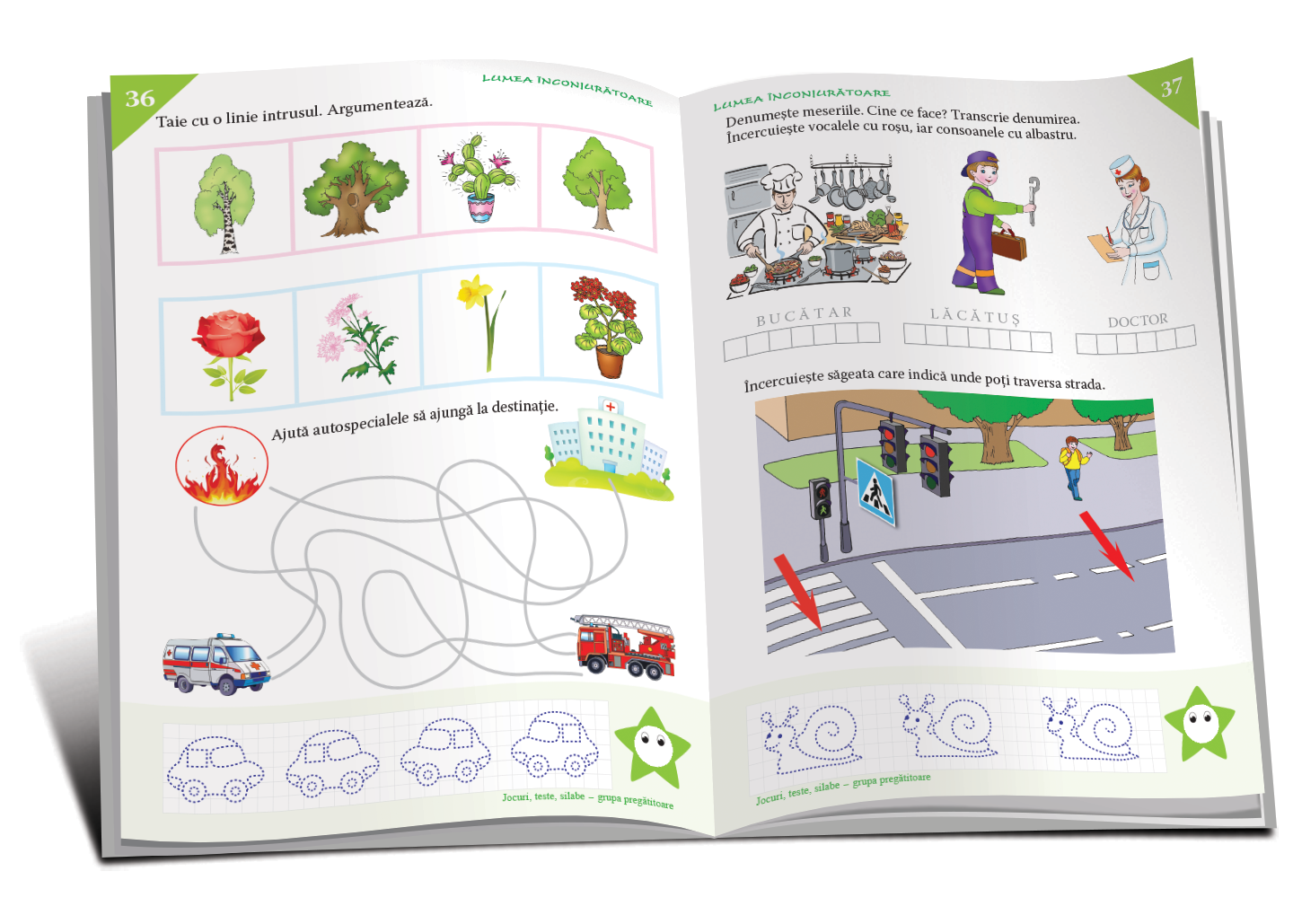 • lumea înconjurătoare (identificarea meseriilor; calendarul: zilele saptămânii, lunile anului; anotimpurile; fructe-legume, etc.)